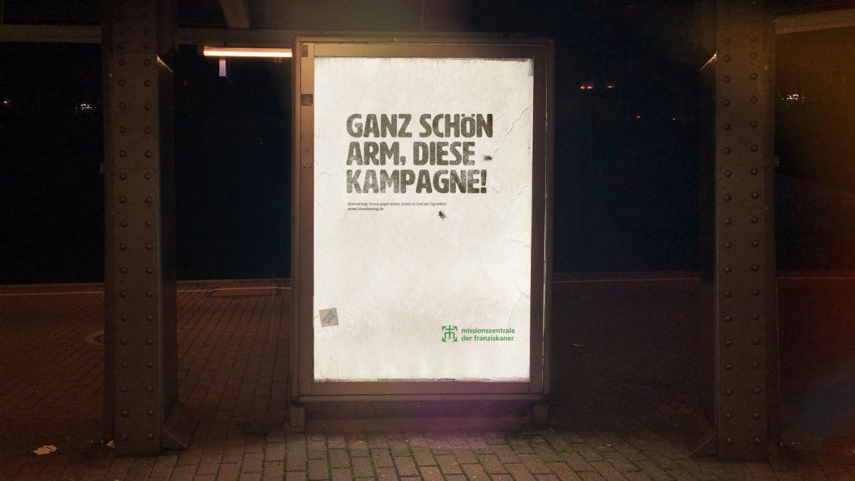 Was lag also näher, als dafür eine „arme“ Kampagne zu entwerfen, um das selbstlose Schaffen der Franziskaner bekannt zu machen und die Aktion „10 Cent am Tag“ zu bewerben? Genau! Wir freuen uns, dass die Missionszentrale der Franzikaner in Bonn diesen …nun ja… etwas unkonventionellen Weg mitgeht. Hier geht es zur Landingpage der Kampagne.